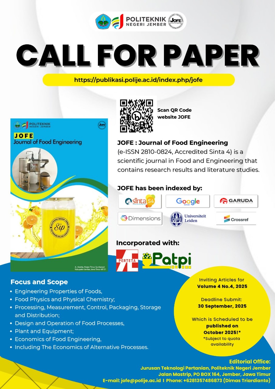 We are pleased to invite academicians, lectures, researchers, and professionals to submit their high-quality, original research manuscripts to be considered for publication in the Journal of Food Engineering (JOFE), scheduled for release in October 2025.